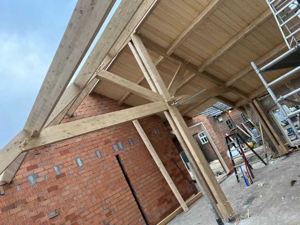 Ook de kapconstructie is volledig vernieuwd in eiken, met geïsoleerde dakplaten, en de bestaande dakpannen zijn hergebruikt om de authentieke uitstraling te behouden. Een perfecte mix van oud en nieuw.